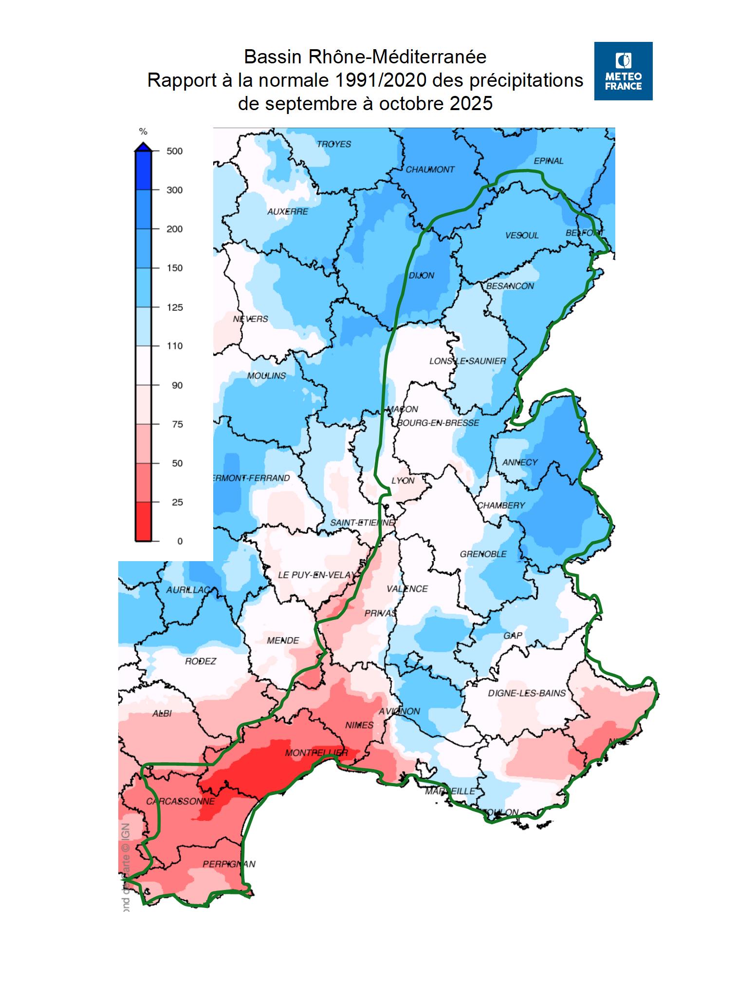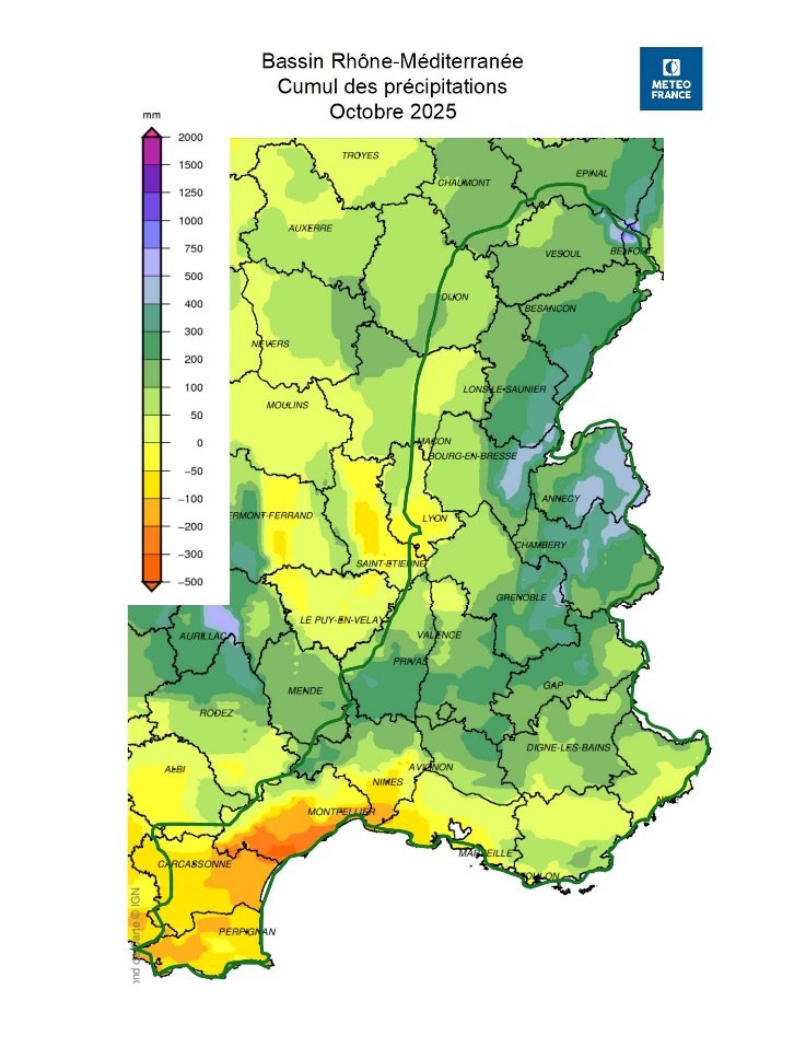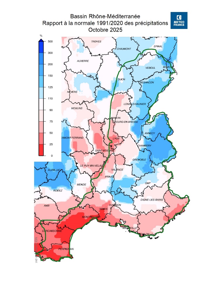 Avec un cumul de précipitations agrégées de 138 mm sur le nord du bassin, soit 111 % de la normale, ce mois d’octobre 2025 se place au 26ᵉ rang des mois d'octobre les plus pluvieux depuis 1959. Les précipitations se sont essentiellement concentrées sur la dernière décade. Le 29 octobre, un épisode cévenol touche le sud de la Drôme-Ardèche. Les cumuls atteignent 60 à 80 mm en 12 h, localement 134 mm à Grospierres et 109 mm aux Vans en Ardèche, provoquant des dégâts dans la région de Pierrelatte et une crue importante de l’Eygues dans la Drôme. Sur le mois, l’excédent dépasse les 80 % sur les Alpes et le Bugey, avec une maximale de 120 % près de Chamonix en Haute-Savoie. Les précipitations sont excédentaires de 10 à 30 % sur la Franche-Comté et le sud de la Drôme. De la Saône-et-Loire aux Cévennes ardéchoises, le déficit est de 30 à 50 %.