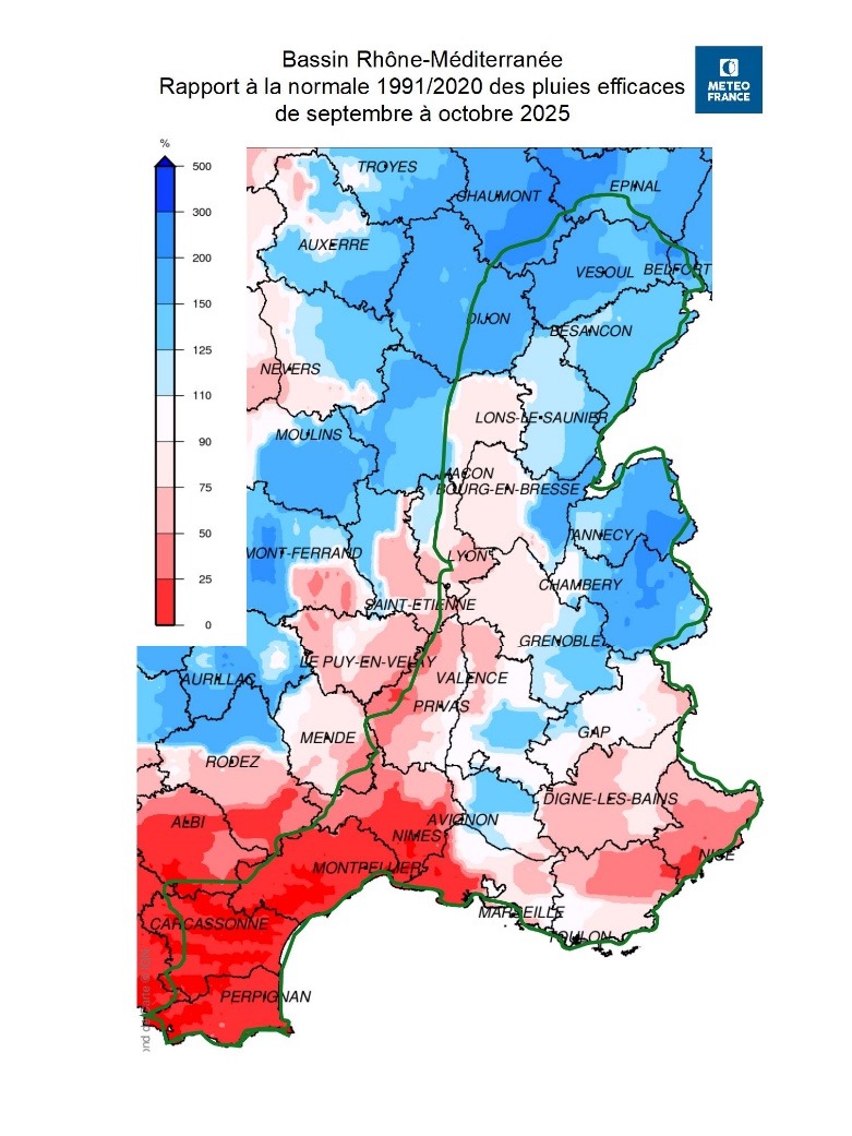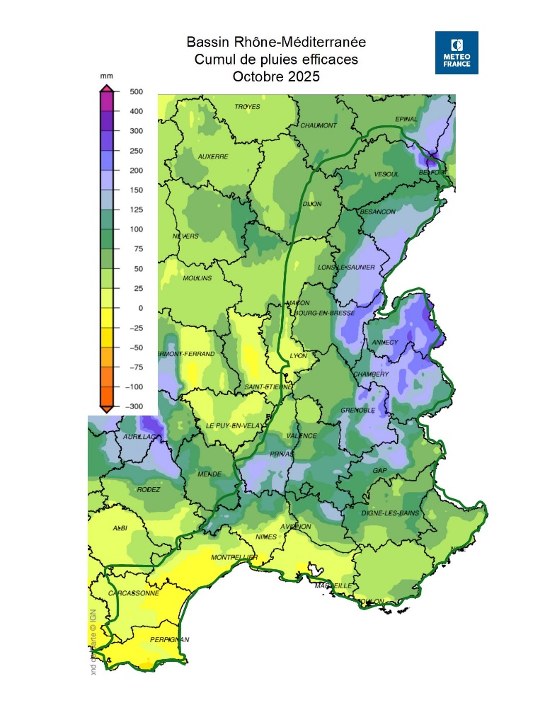 Avec 102 mm de pluies efficaces agrégées sur le nord du bassin en octobre 2025, soit un excédent de 15 % par rapport à la normale, c’est le 27ème cumul le plus élevé depuis 1959. Les pluies efficaces sont excédentaires de 10 à 40 % de la Haute-Saône au sud de l’Isère et de 50% à 75% sur les sommets alpins. Elles sont déficitaires de 20 à 50 % de la Saône-et-Loire aux Cévennes.