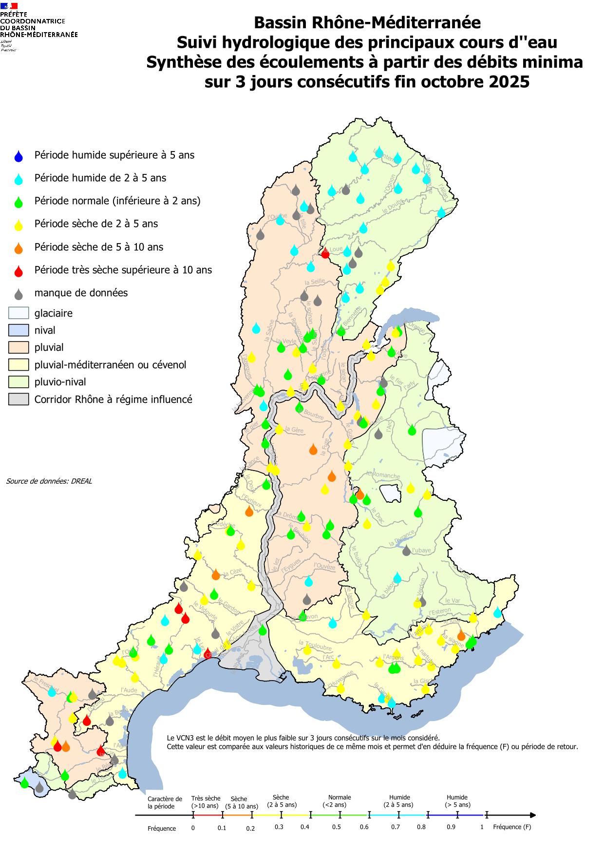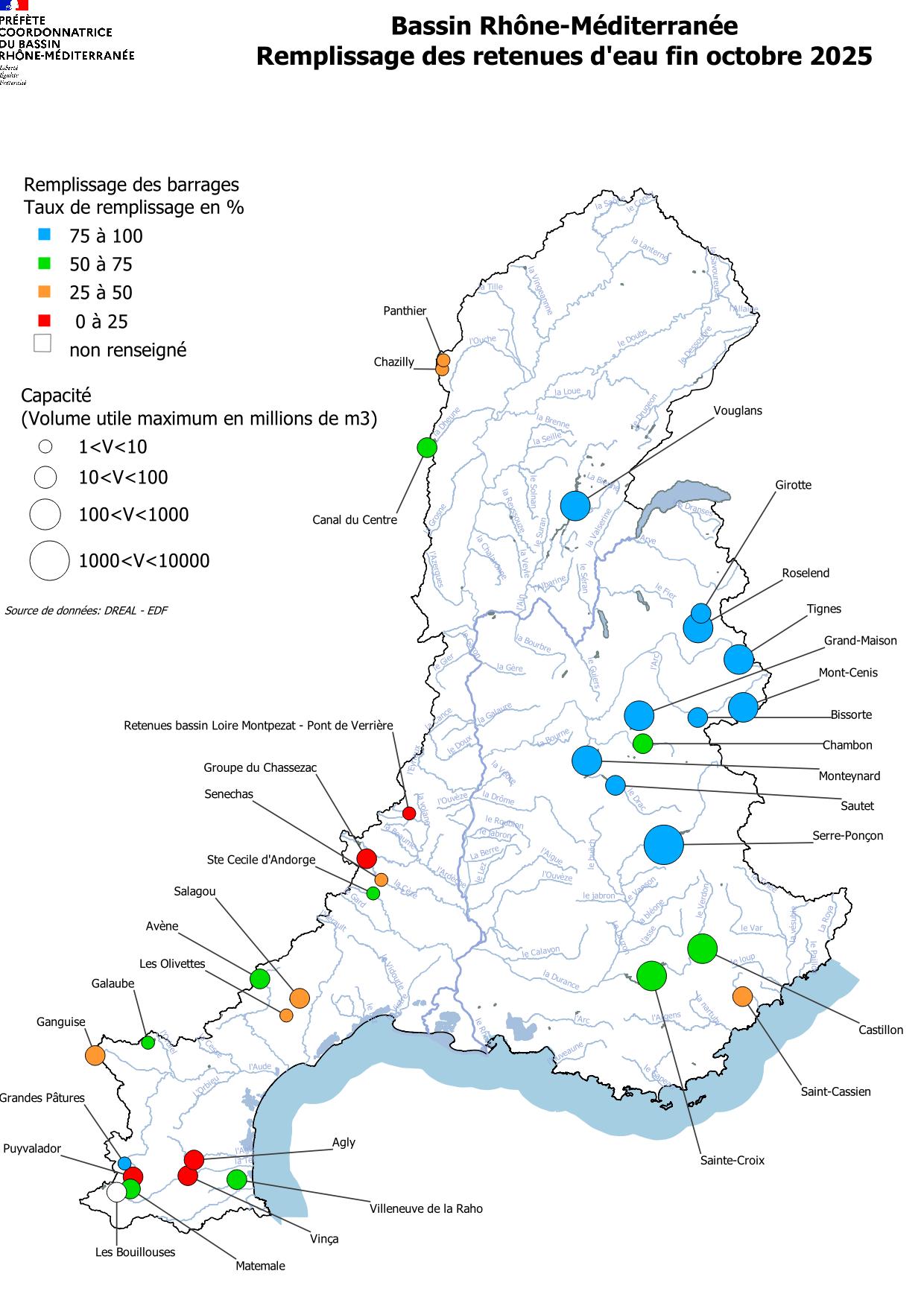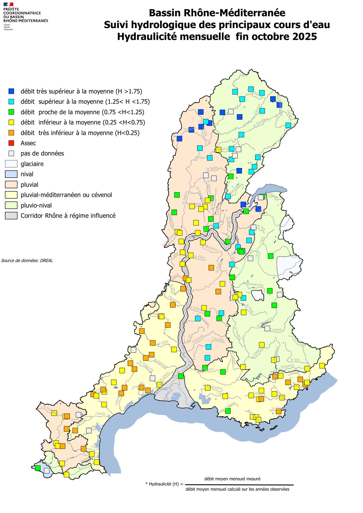 Fin octobre 2025, la situation reste favorable sur les cours d'eau du bassin de la Saône amont et en Franche-Comté. L'hydraulicité est en hausse sur les Alpes du Nord, avec des débits désormais globalement supérieurs à la moyenne. Sur la Saône aval et l'axe Rhône, l'hydraulicité est en baisse. Sur le pourtour méditerranéen, les débits moyens mensuels sont désormais inférieurs aux normales, les épisodes de fortes pluies n'ont pas amélioré durablement la situation. L'hydraulicité est faible sur les cours d'eau de la Côte d'Azur et faible à très faible des Cévennes au Roussillon.