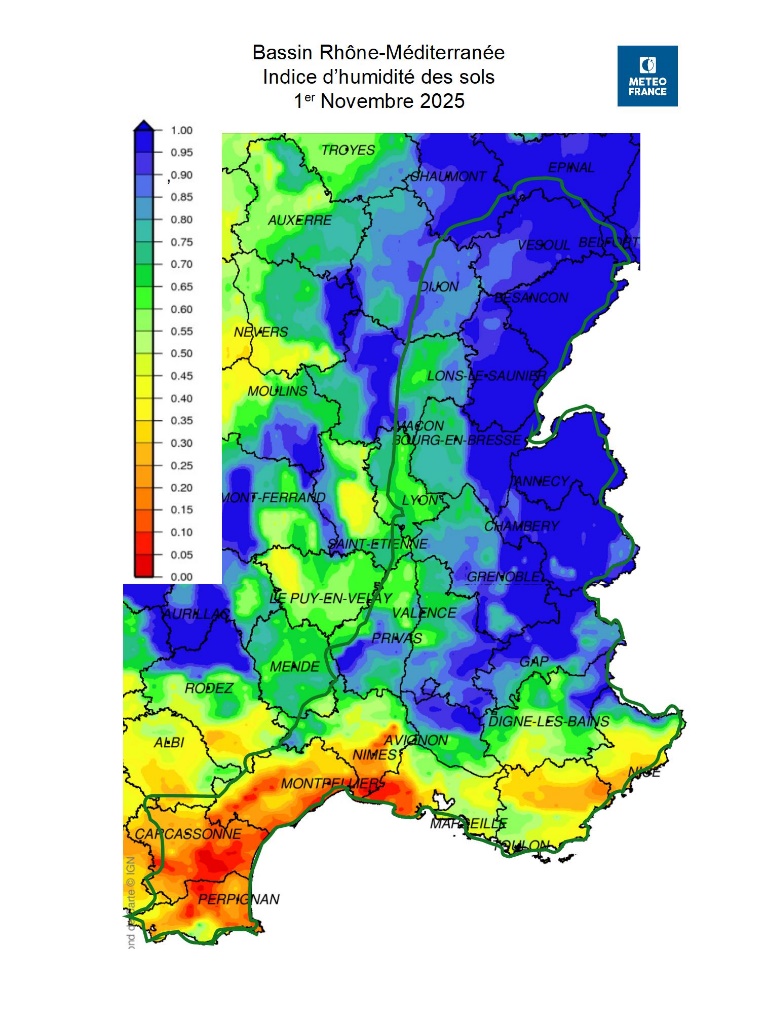 Au 1er novembre 2025, les sols sont humides à très humides sur la moitié nord du bassin, voire proches de la saturation des Vosges au sud de l’Isère.