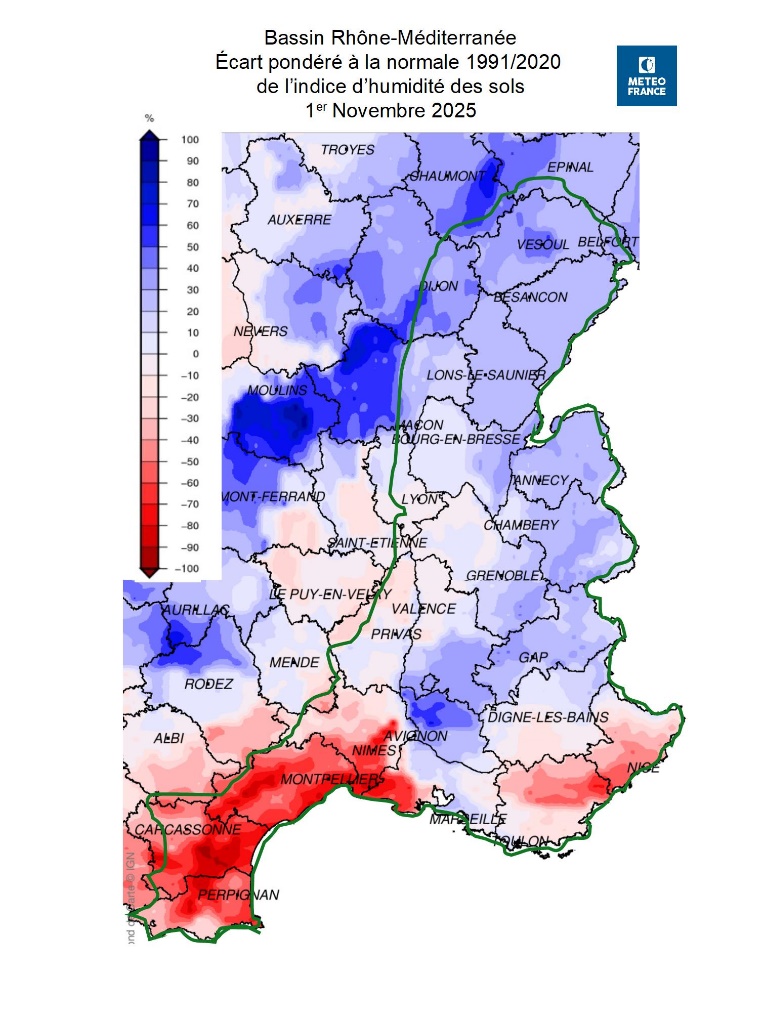 Le bilan pluviométrique de ce mois d'octobre 2025 est de nouveau contrasté. Les précipitations sont excédentaires et les sols sont humides des Vosges au Bugey et des Alpes du Nord au Vaucluse. De la Saône-et-Loire aux Cévennes, malgré un épisode cévenol important, le déficit est de 30 à 50 %. Après deux épisodes méditerranéens, les cumuls sont tout de même déficitaires sur les Bouches-du-Rhône et le Var. Les sols sont secs et le déficit pluviométrique est plus marqué sur les Alpes-Maritimes et l'Occitanie, atteignant 50 à 90 % sur le littoral occitan et les reliefs des Pyrénées-Orientales.
