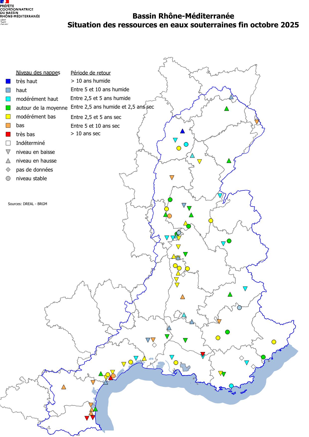 Sur ce mois d'octobre 2025, la recharge a débuté pour les nappes réactives de Bourgogne-Franche-Comté, des Alpes et du Rhône inférieur. La tendance générale reste à la baisse sur les nappes inertielles du couloir Saône-Rhône et les nappes du littoral, avec des niveaux globalement inférieurs aux normales du Gard aux Pyrénées-Orientales.